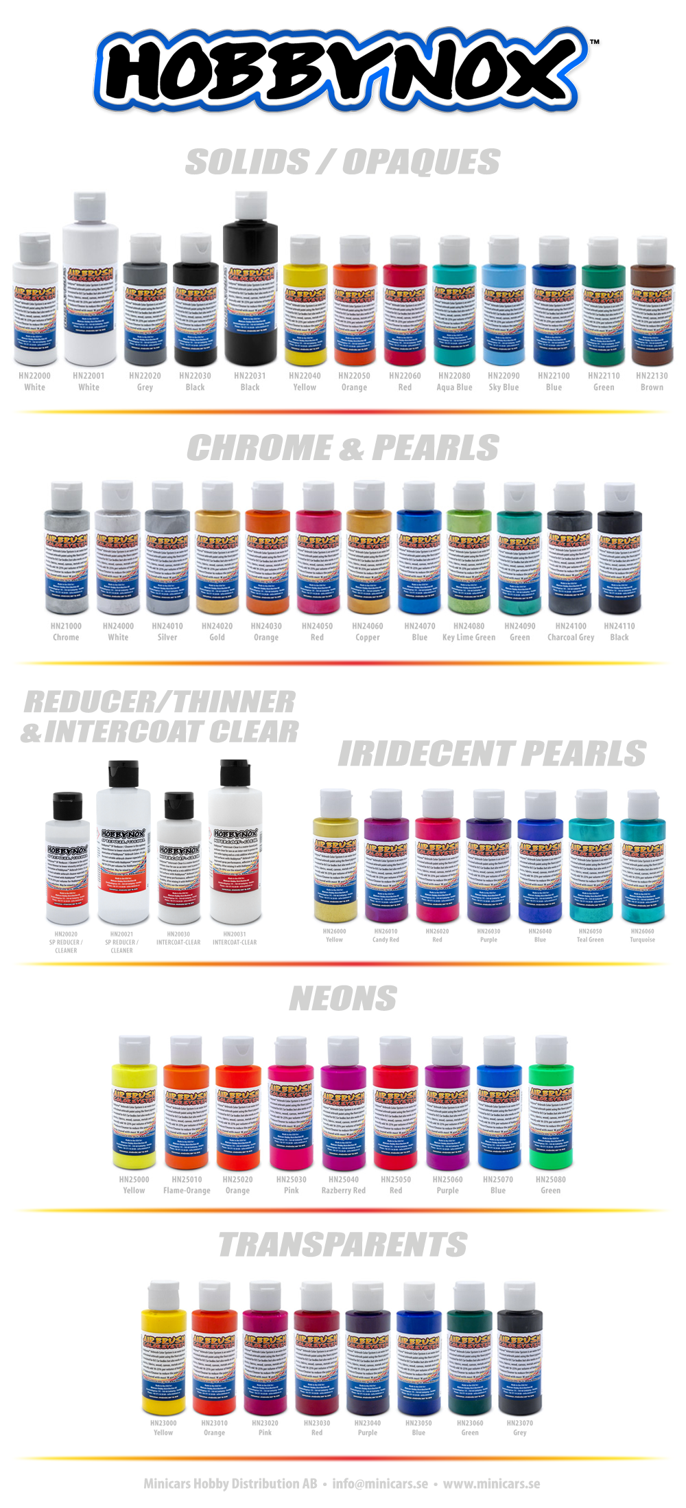 Hobbynox Airbrush Colors include Opaque (solids), Transparent, Neon, Pearl and Iridescents.