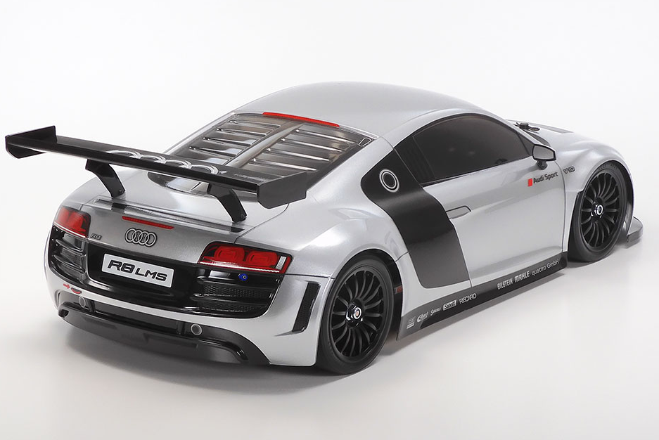 Based upon the Audi sportscar R8 and conforming to GT3 regulations, the Audi R8 LMS was announced in 2008. A 5.2-liter V10 midship engine capable of over 500hp was mounted in a lightweight aluminum space frame. Body sections were modified, and the drivetrain was changed from 4WD to a rear-wheel drive system. From 2009 onward, this car was delivered to racing teams around the world and achieved many racing successes. This R/C model assembly kit recreates that car, with a polycarbonate body and separately molded rear wing and side mirror parts. The TT-02 chassis is a trusted platform, and here is assembled with wide rear tread.